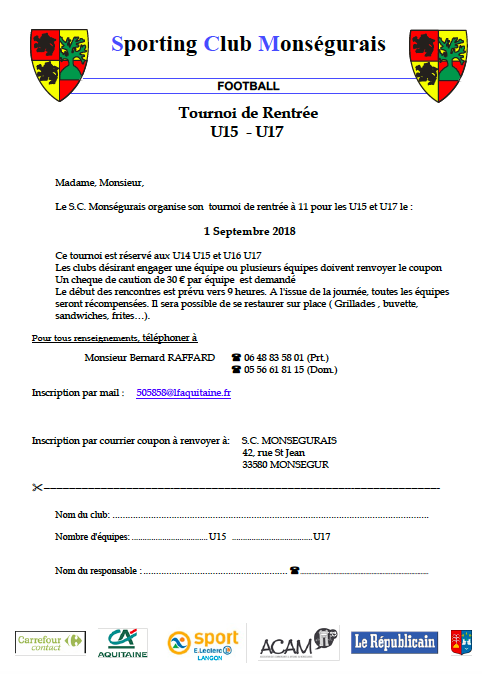 Le SC MONSEGUR organise le 1er Septembre son traditionnel tournoi de rentrée U14/U15 et U16/U17. Début du tournoi à 9H. Chèque de caution de 30 €.