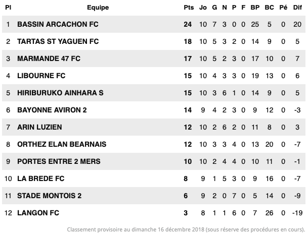 Ce samedi, le FC Bassin Arcachon faisait le déplacement chez un concurrent direct à la montée, le FC Libourne. Toujours invaincus en championnat, les protégés de Steve Savidan avaient par cette rencontre l’opportunité de laisser cet adversaire à neuf points. Et ce fut chose faite. Malgré leur volonté de l’emporter afin de revenir à trois points, les Libournais n’ont pas su trouver les arguments et ont dû se résoudre à laisser les trois points de la victoire. Ainsi, Libourne est désormais à neuf points. Le second, Tartas, étant lui à six points, Bassin Arcachon est aussi assuré de terminer champion d’automne en janvier prochain puisqu’il reste la journée 7 de régional 1 à jouer avant de clôturer les matchs aller.