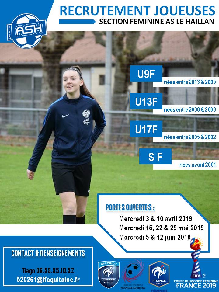 En cette année de coupe du Monde féminine en France, la section féminine du Haillan organise ses portes ouvertes pour attirer et recruter de nouvelles joueuses dans toutes les catégories qui souhaitent intégrer un projet sportif structuré et encadré par des éducateurs diplômés.