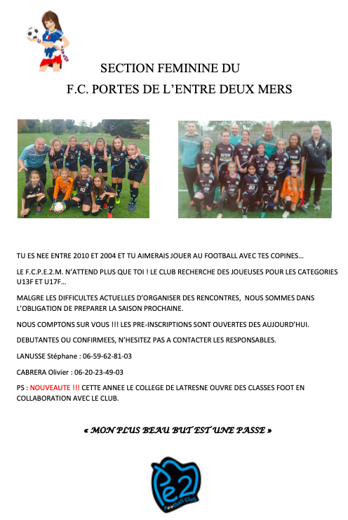 Annonces La section féminines du FC Portes Entre Deux Mers recrute !