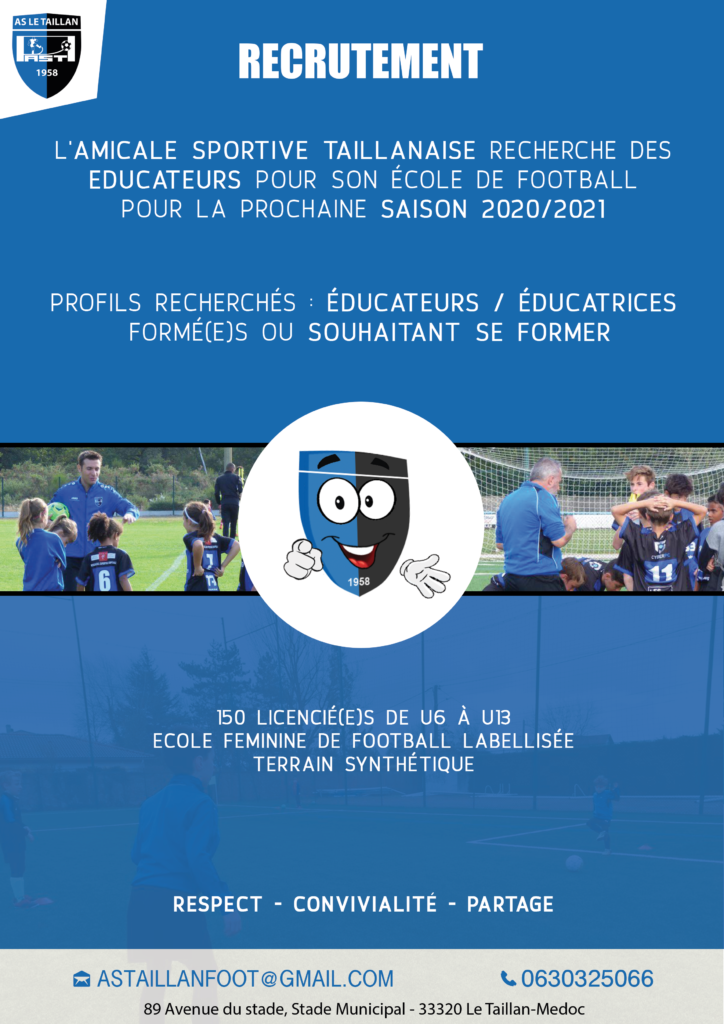 L’Amicale Sportive Taillanaise recrute des éducateurs/éducatrices pour la saison 2020/2021, dans les catégories U7 à U13 pour ses écoles de football (garçons et filles). Club structuré, à la fois sérieux et convivial, qui dispose d’un terrain synthétique de dernière génération qui permet d’assurer une activité tout au long de la saison, sauf cas exceptionnel comme actuellement.