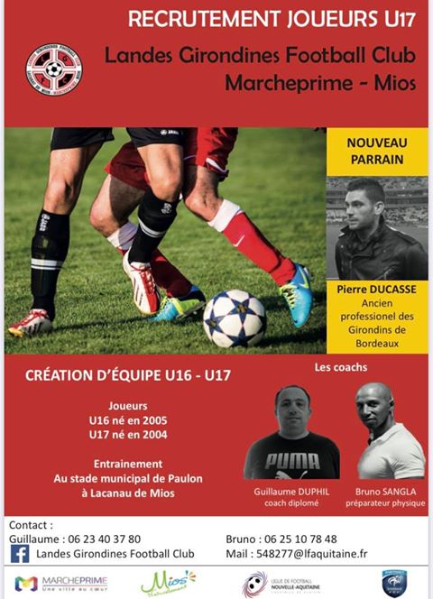 Annonces Equipe U17 de Landes Girondines, parrainée par Pierre Ducasse, recrute © Foot-Gironde AnnoncesJoueurs Equipe U17 de Landes Girondines, parrainée par Pierre Ducasse, recrute 2 juin 2020 0 FacebookTwitterWhatsAppEmailImprimer ARTICLES CONNEXESPLUS DE L'AUTEUR Annonces Club cherche coach gardiens Annonces Recherche poste secrétaire et ou administratif Annonces Recrutement joueurs