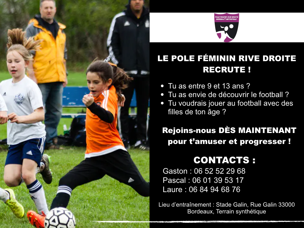 Club familial, convivial ou il fait bon jouer au football, le Pôle Féminin Rive Droite bénéficie d’un terrain synthétique pour s’entraîner tout au long de l’année (Stade Galin) ainsi que d’éducateurs à l’écoute pour une activité 100% plaisir.