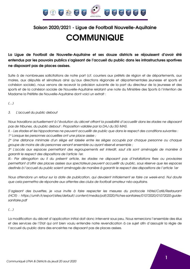 La lettre envoyée par le président de la ligue Nouvelle-Aquitaine et les présidents des 12 districts a reçu une réponse. Une bonne nouvelle pour les clubs ne disposant pas de tribunes.