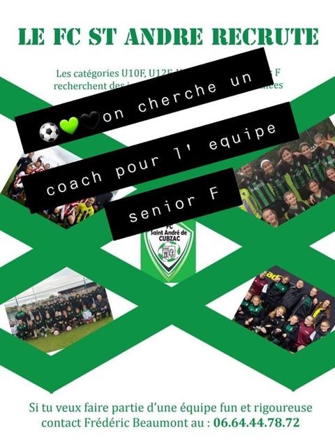 La section féminine du FC St André de Cubzac progresse et souhaite compléter ses équipes U16-17-18F et senior F. Viens tester lors d’un entraînement au stade Laurent Ricci à St André de Cubzac. Il nous manque aussi un coach pour l équipe senior F