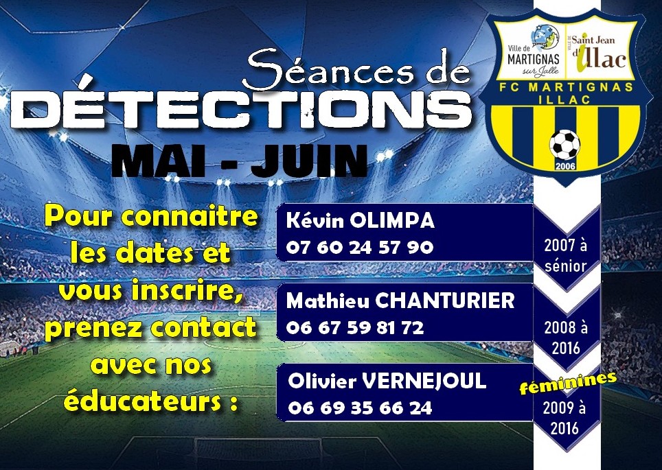 Annonces Le FC Martignas-Illac organise des détections © Foot-Gironde AnnoncesJoueurs Le FC Martignas-Illac organise des détections 16 mai 2021 0 FacebookTwitterWhatsAppEmailImprimer ARTICLES CONNEXESPLUS DE L'AUTEUR Annonces Recrute gardienne U 15 Annonces Club cherche coach gardiens Annonces Recherche poste secrétaire et ou administratif