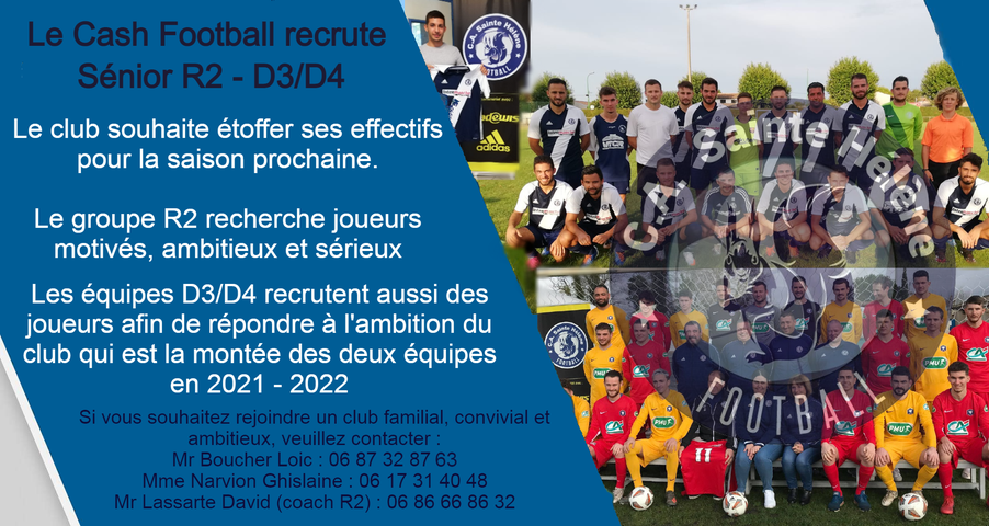 Annonces Le CA Sainte-Hélène recrute des joueurs seniors © Foot-Gironde AnnoncesJoueurs Le CA Sainte-Hélène recrute des joueurs seniors 22 mai 2021 0 FacebookTwitterWhatsAppEmailImprimer ARTICLES CONNEXESPLUS DE L'AUTEUR Annonces Recrute gardienne U 15 Annonces Club cherche coach gardiens Annonces Recherche poste secrétaire et ou administratif
