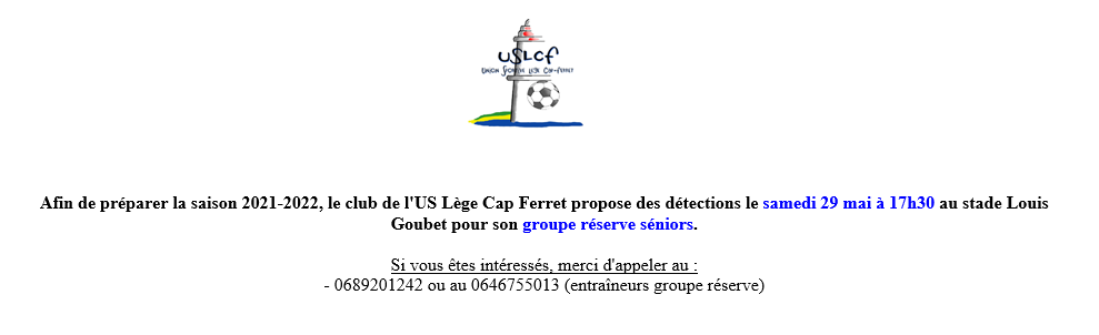 Annonces Lège-Cap-Ferret organise une détection pour sa réserve seniors © Foot-Gironde AnnoncesJoueurs Lège-Cap-Ferret organise une détection pour sa réserve seniors 25 mai 2021 0 FacebookTwitterWhatsAppEmailImprimer ARTICLES CONNEXESPLUS DE L'AUTEUR Annonces Recrute gardienne U 15 Annonces Club cherche coach gardiens Annonces Recherche poste secrétaire et ou administratif