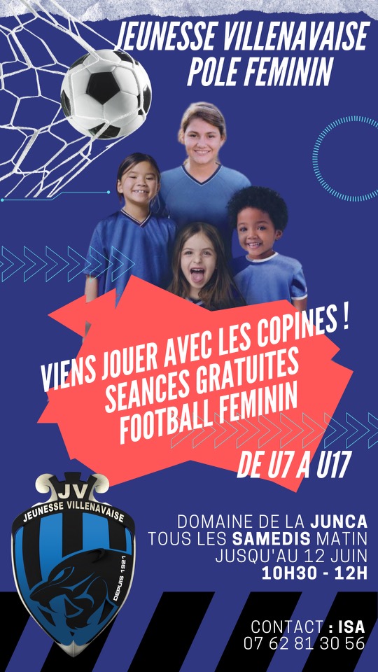 Après 2 ans de stand-by, l’équipe féminine senior de la Jeunesse Villenavaise se recrée avec un nouveau staff et un vrai projet de jeu. L’école de foot se renforce également avec un recrutement de filles de U7 à U17. N’hésitez pas à venir les découvrir, ainsi que tout ce qu’à à offrir ce club emblématique ! Contact : Isabelle 0762813056 ou Vidal 0667804766