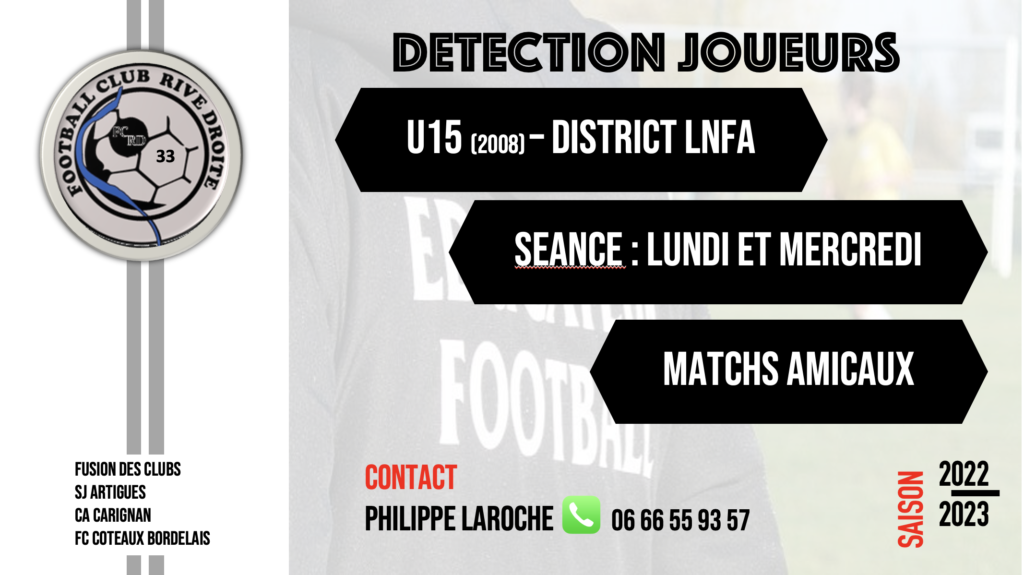 Annonces Le FC Rive droite recrute des joueurs U15 © Foot-Gironde AnnoncesJoueurs Le FC Rive droite recrute des joueurs U15 6 mai 2022 0 FacebookTwitterWhatsAppEmailImprimer ARTICLES CONNEXESPLUS DE L'AUTEUR Annonces Recherche poste secrétaire et ou administratif Annonces Recrutement joueurs Annonces Recherche entraîneur seniors
