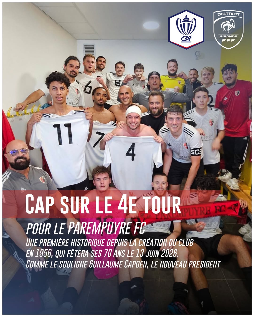 Après des succès face au Haillan (R3), Saint-Porchaire (D3) et Eysines (D1), l’équipe senior de Parempuyre FC, évoluant en Départemental 3, se qualifie pour le 4e tour de la Coupe de France. Pour cette étape, les Parempuyriens affronteront Saint-Hilaire (D3) ce dimanche 28 septembre à 15h.